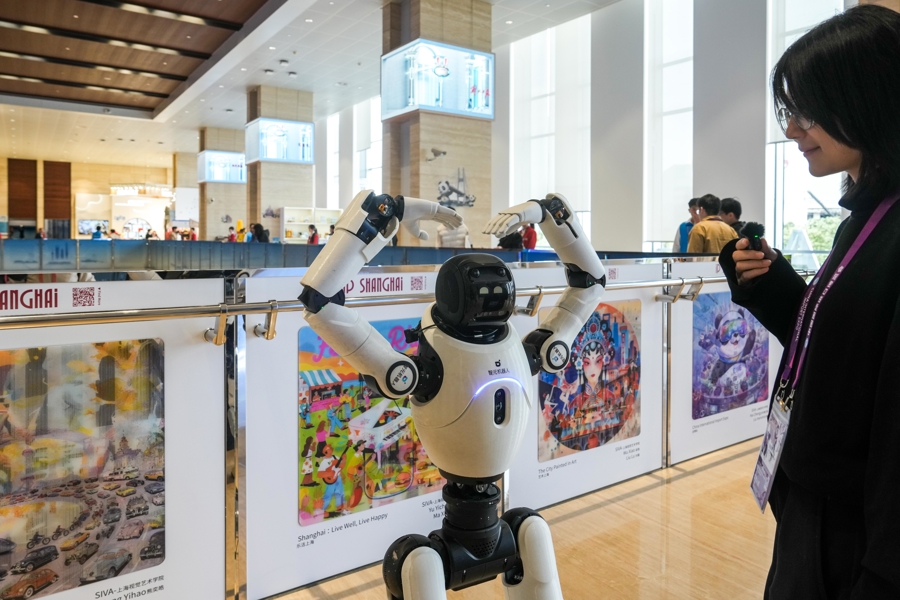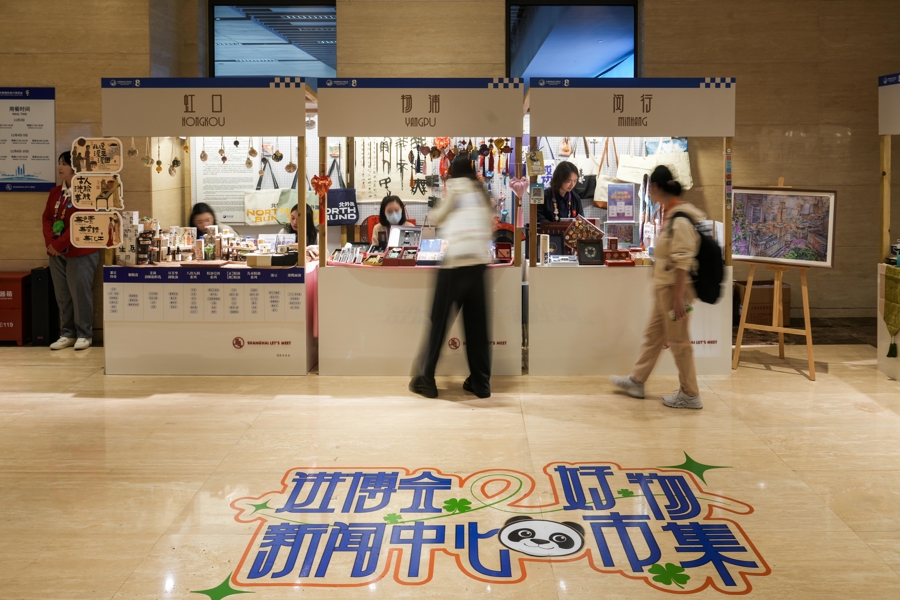 第八届进博会新闻中心文化展示展演区域全面升级,精心打造一系列可感知、可互动、可传播的沉浸式文化空间。比如,新闻中心一楼“城市形象视觉橱窗”数字展,借助MR技术实现上海发布平台吉祥物“兔小布”与城市影像的实时交互,打造沉浸式上海Citywalk;二楼玻璃环廊的第三届城市艺术插画展,汇聚全球11个国家52位艺术家的65幅原创插画,通过光栅动画技术,让媒体记者在步履移动间呈现“移步换景、影随人动”的奇妙效果。