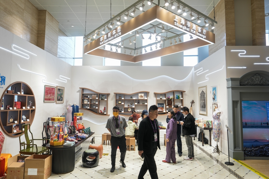 上海非遗客厅以“上海会客厅,非遗新体验”为主题,集中呈现新时代上海非遗在保护传承、创新发展和生活化融合方面的发展成果。静态展区汇集约80件(套)兼具传统底蕴与现代创意的非遗精品,其中2025年非遗国潮文创大赛获奖作品与高校研培成果,凸显“非遗新生代”的创造力。数字可视区以石库门竖屏和电子屏播放非遗双语视频,生动演绎非遗在当代的多元场景。