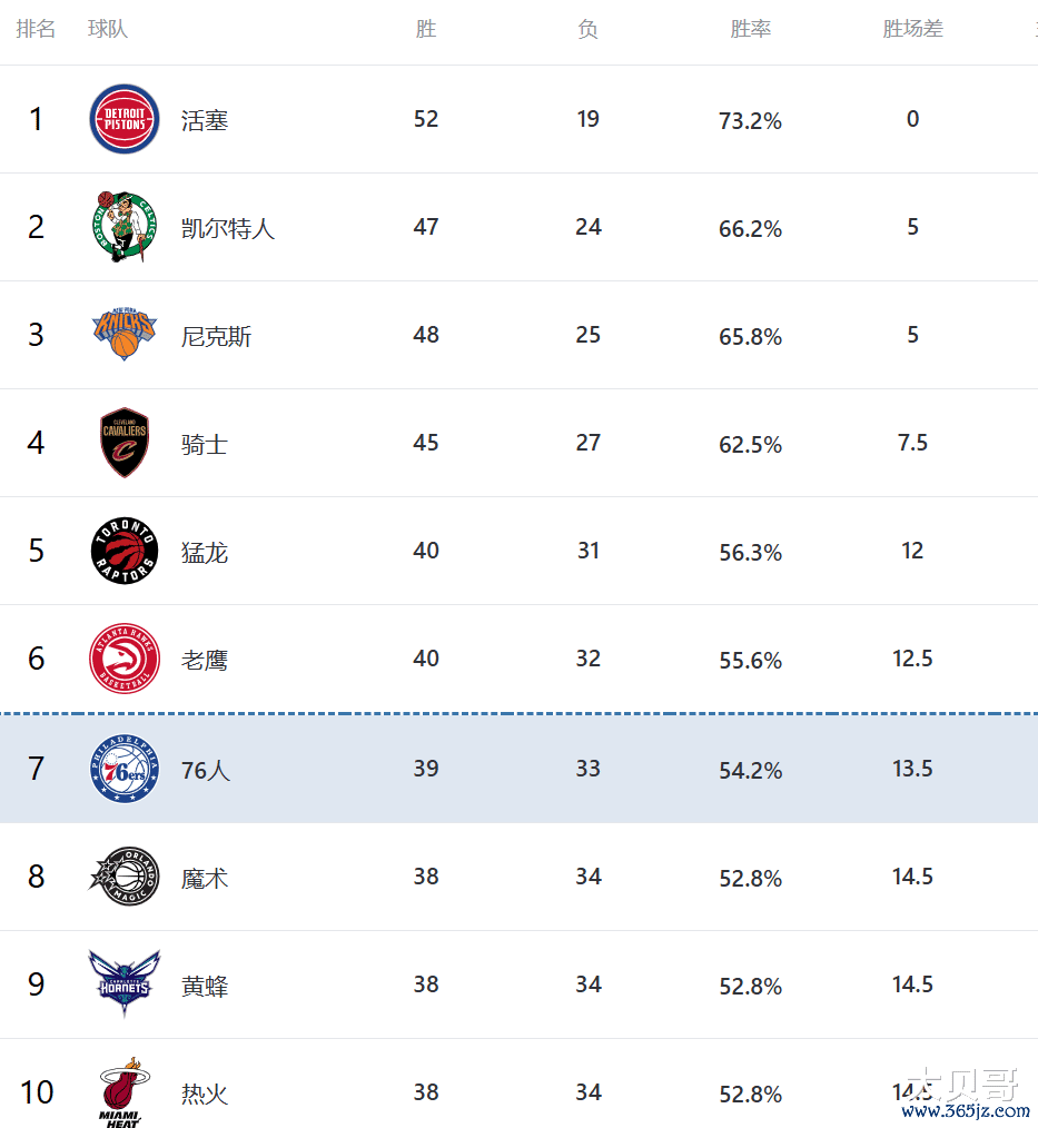 赢球之后的黄蜂豪取4连胜,球队胜场差追平了第八的魔术,他们现在排在第九,不过第十的热火和黄蜂、魔术战绩也是持平,都是38胜34负,他们因为交手战绩吃亏,所以排在了第十,第七的76人不过才领先这4支球队1个胜场差,东部现在的惨了程度比起西部可能更甚,甚至说这可能是历史至今最惨烈的东部,一场输球,附加赛区就会发生排名变化,谁都输不起,毕竟第七和第八可是多一条命。
