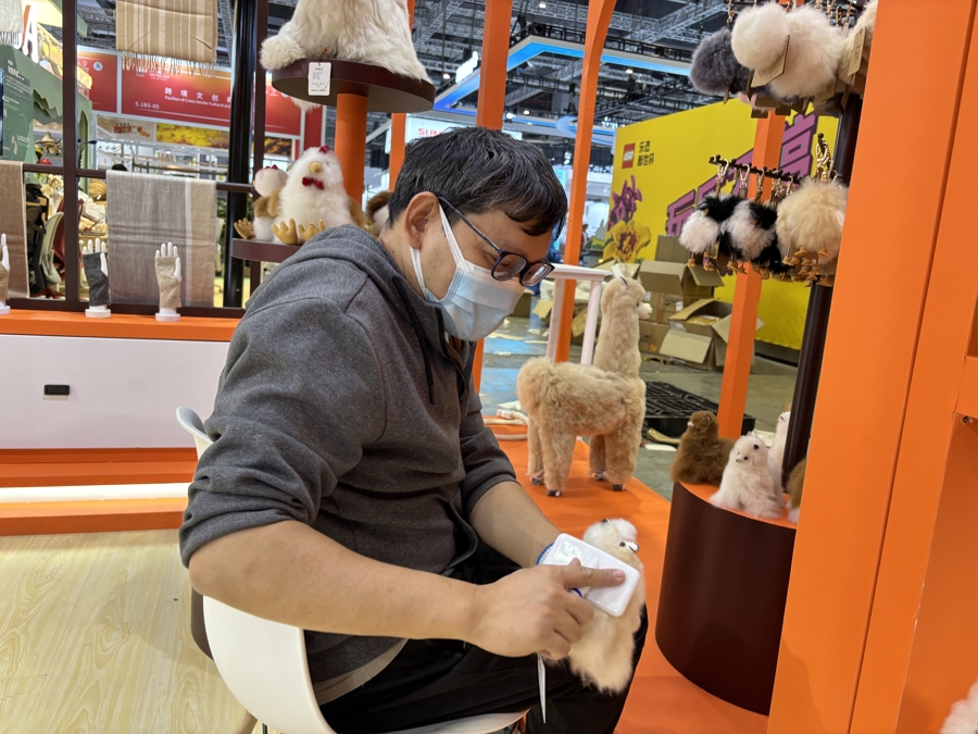 来自澳大利亚的羊驼饰品制造商INJOI第八次来到了进博会。展台上,几位工作人员人手一把梳子,正在给上百只玩偶轻轻梳毛,确保每一只都蓬松整齐,美美地亮相进博会。